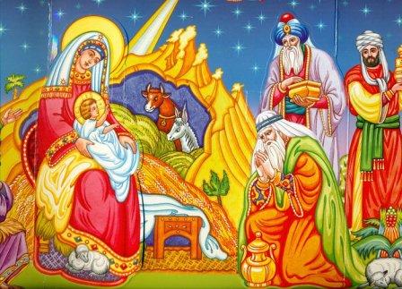 (звучить колядка «По всьому світу», на нижньому поверсі виходять пастухи та царі)